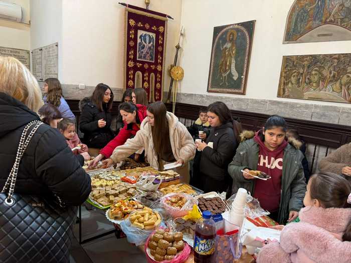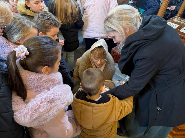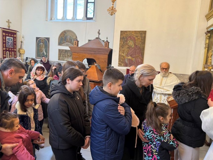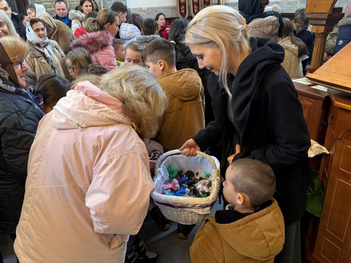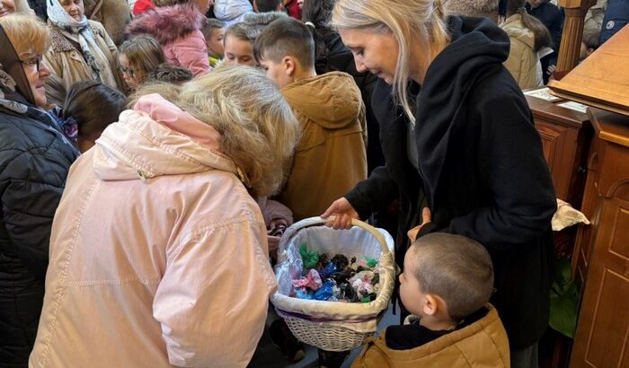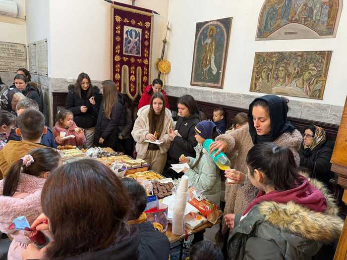 После тога најпре су симболично везали своју вероучитељицу, а затим и маме, баке, тетке… Оне су се дрешиле унапред спремљеним поклонима. Одушевљена дечица су, потом, приступила трпези љубави коју су припремиле маме ученика и вероучитељица.