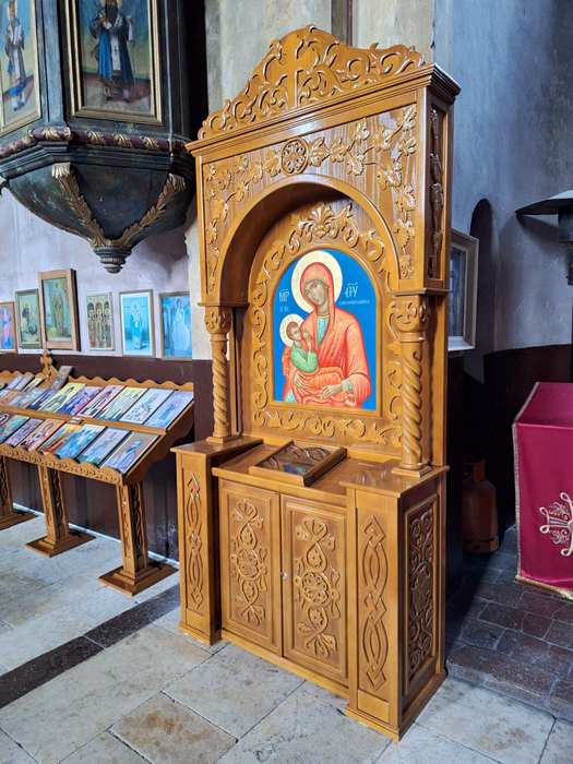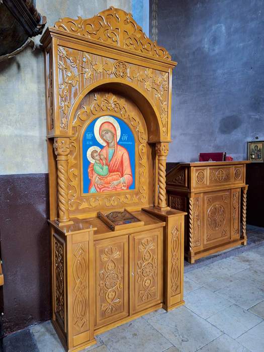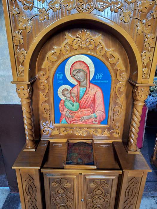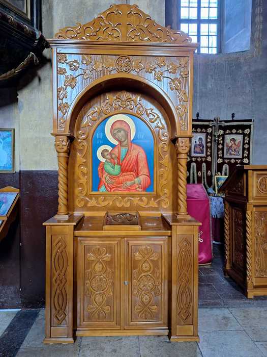 Трон је израђен у мајсторској радионици „Браћа Милосављевић“ у Ломници надомак Крушевца, а приликом постављања у њега је одмах уграђена и икона Пресвете Богородице Млекопитатељнице, такође ручно израђена у иконописачком атељеу „Зограф“ из Земуна.
