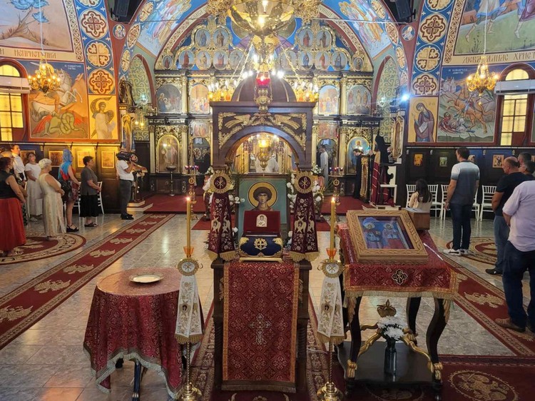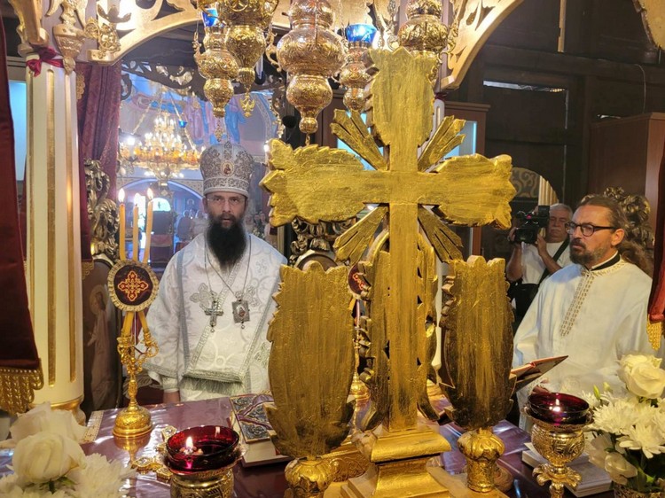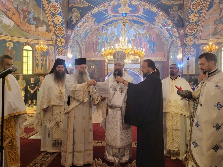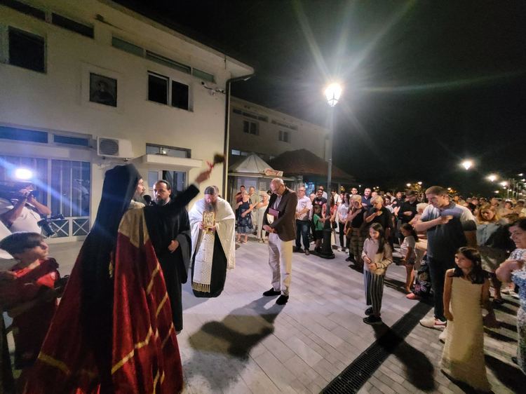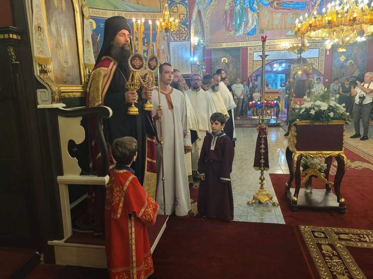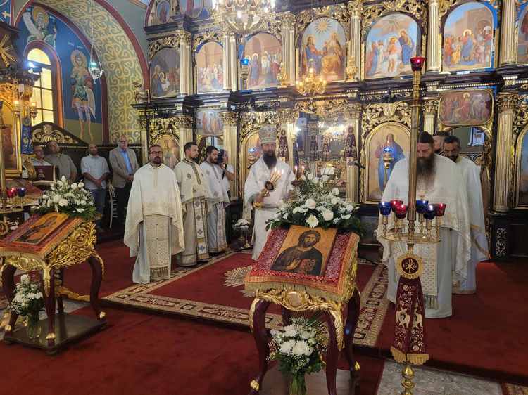 По завршетку богослужења, владика је повео народ у свечану литију у којој су ношене чудотворна икона Светог Пантелејмона и икона Светог Трифуна, донета на поклоњење и целивање благословом игумана манастира Тумане, архимандрита Димитрија Плећевића.