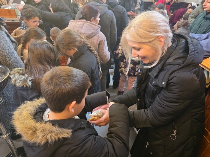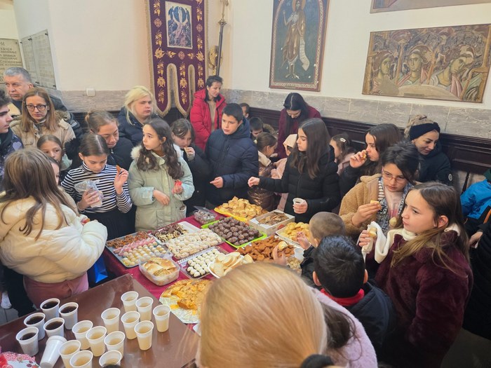 Затим су одушевљена и срећна деца приступила трпези љубави, са сланишима и слаткишима које су припремиле маме и вероучитељица. Кући су отишли срећни и задовољни, са усвојеним знањем о празнику, али и у ишчекивању следећег празника – Очева, када ће везати тату, деду, брата, течу, стрица, комшију, и опет добити неку чоколадицу, јабуку, лизалицу или нешто слично.